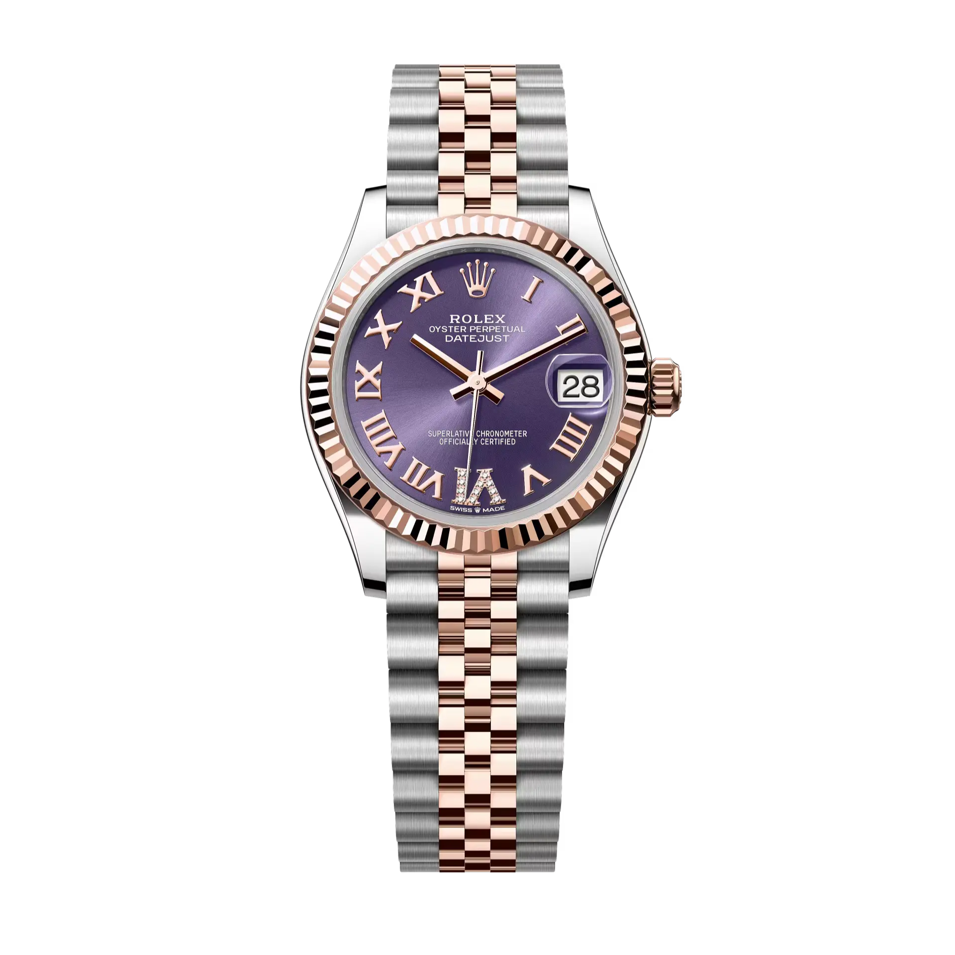 Datejust 31 in Oystersteel and Everose gold features an aubergine, diamond-set dial and a Jubilee bracelet.