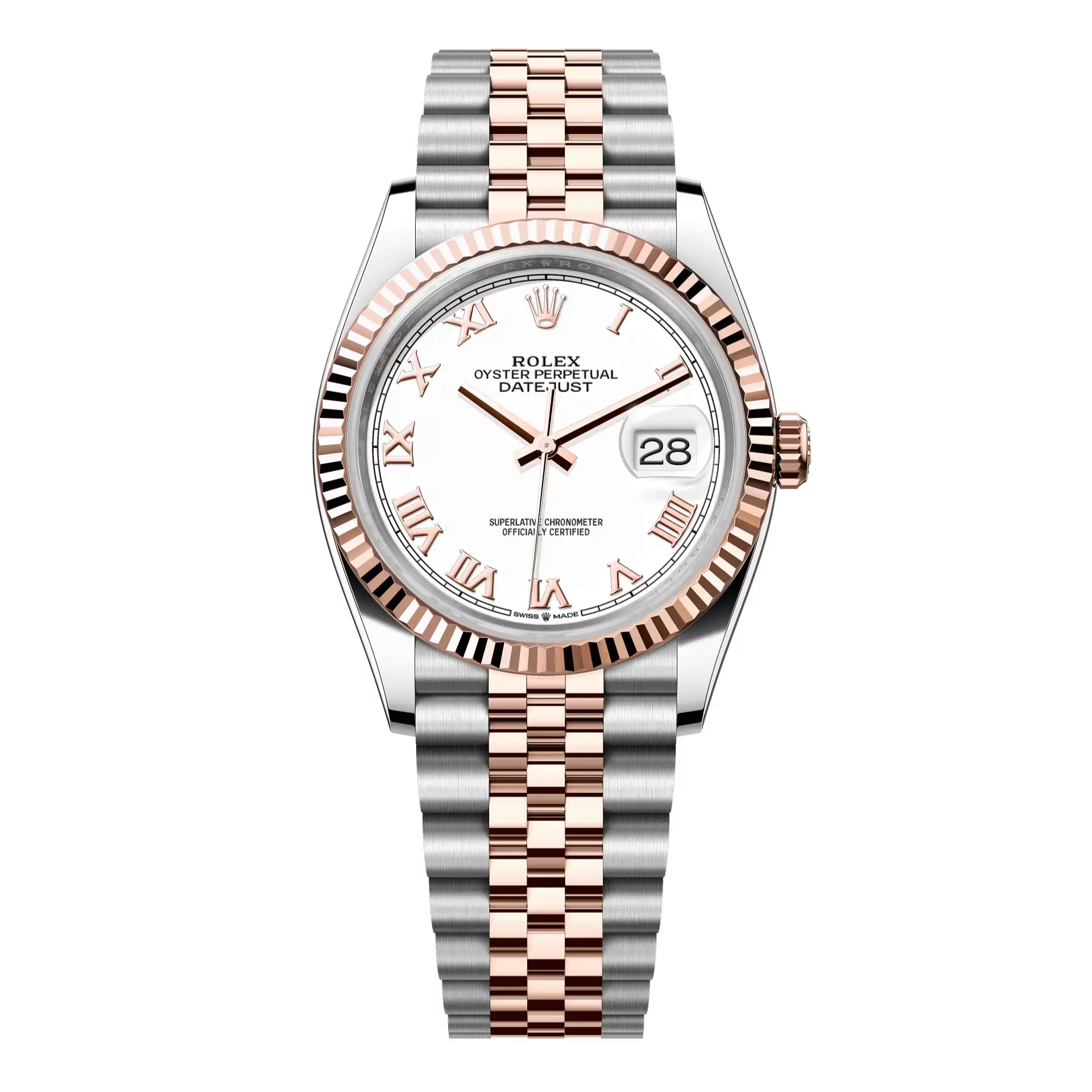 Datejust 36 in Oystersteel and Everose gold features a white dial and a Jubilee bracelet.