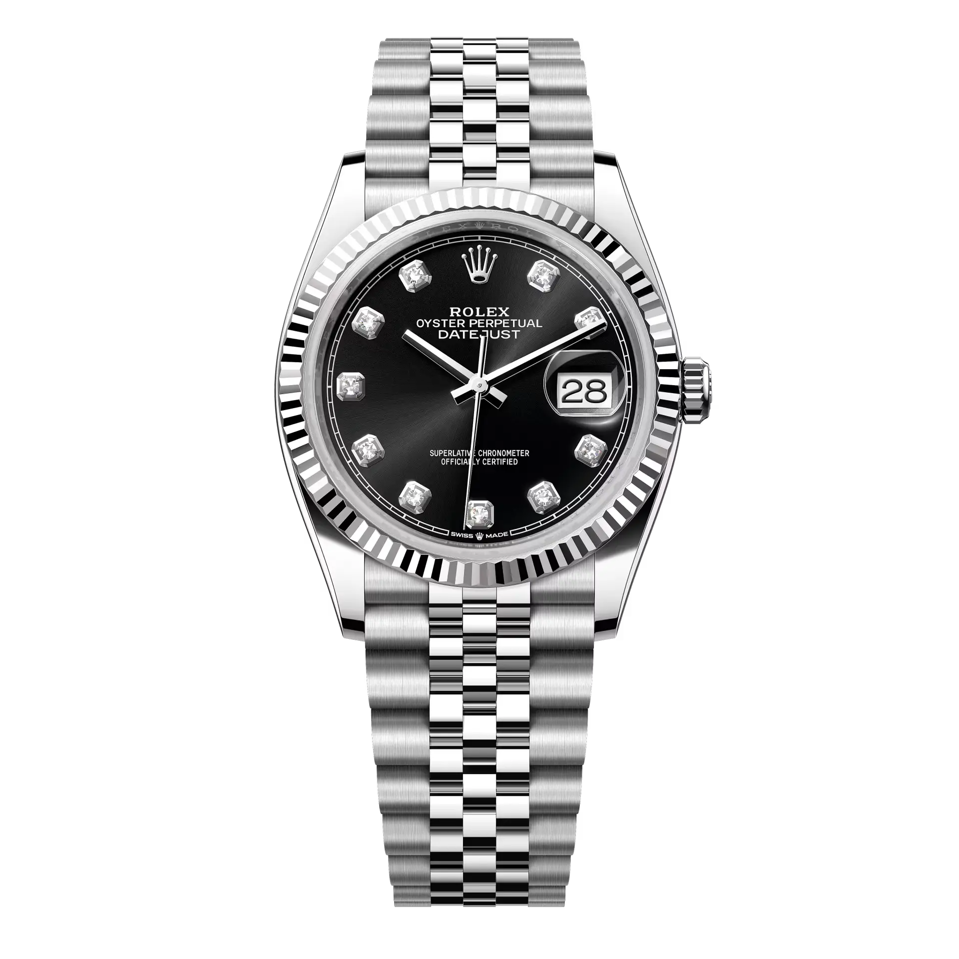 Datejust 36 in Oystersteel and white gold features a bright black, diamond-set dial and a Jubilee bracelet.