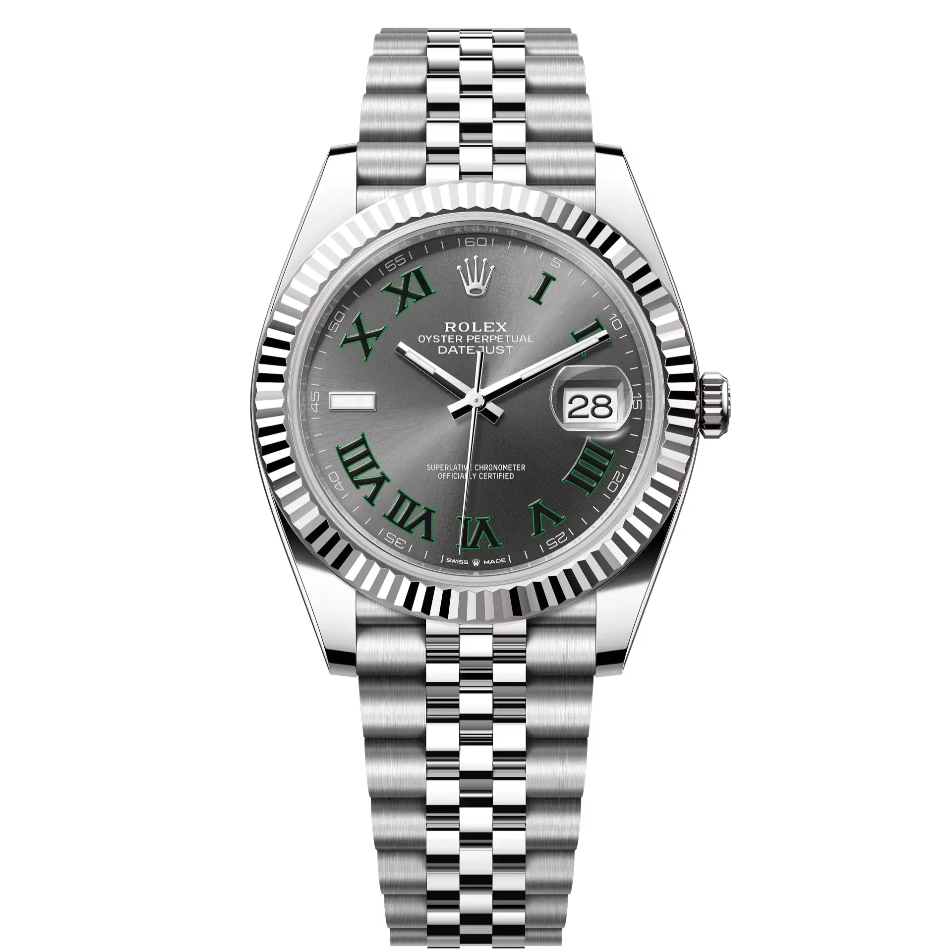 Datejust 41 in Oystersteel and white gold features a Wimbledon dial and a Jubilee bracelet.