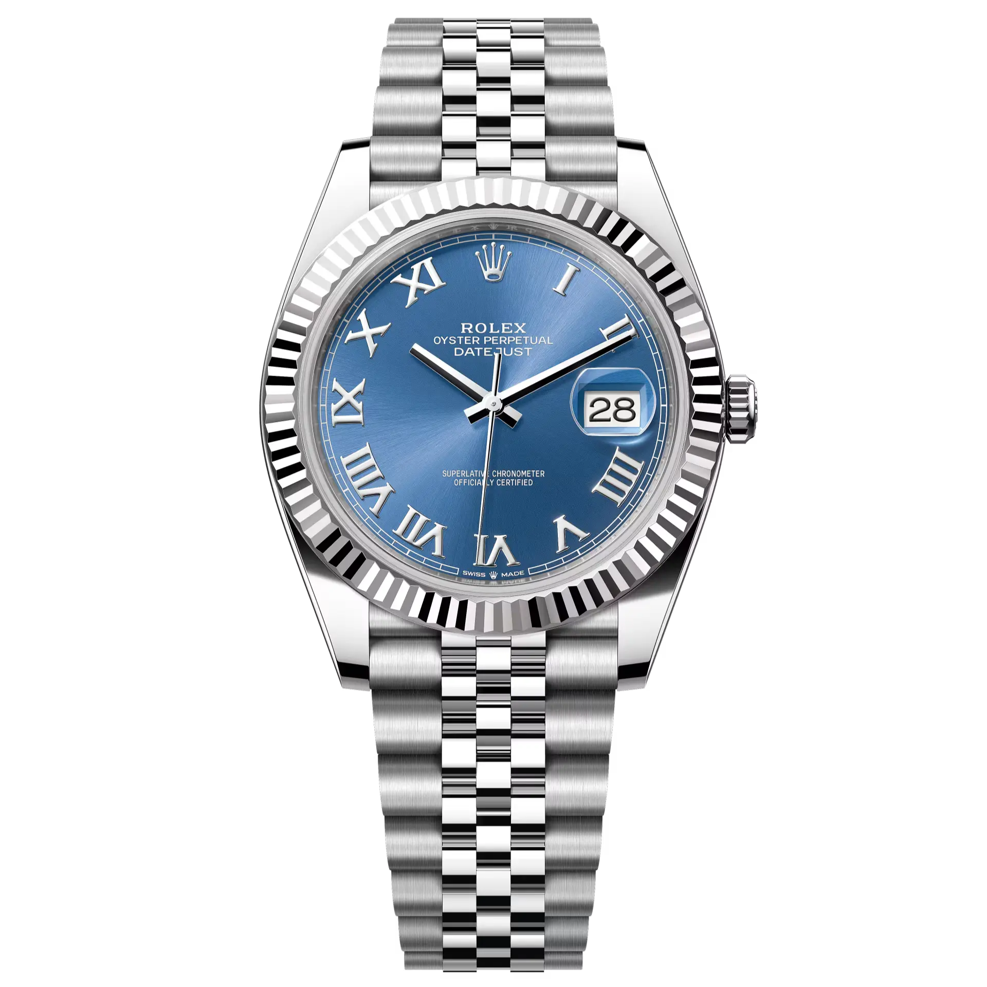 The fluted bezel in white gold adds a signature Rolex touch, while the Jubilee bracelet provides comfort, flexibility, and distinguished style.