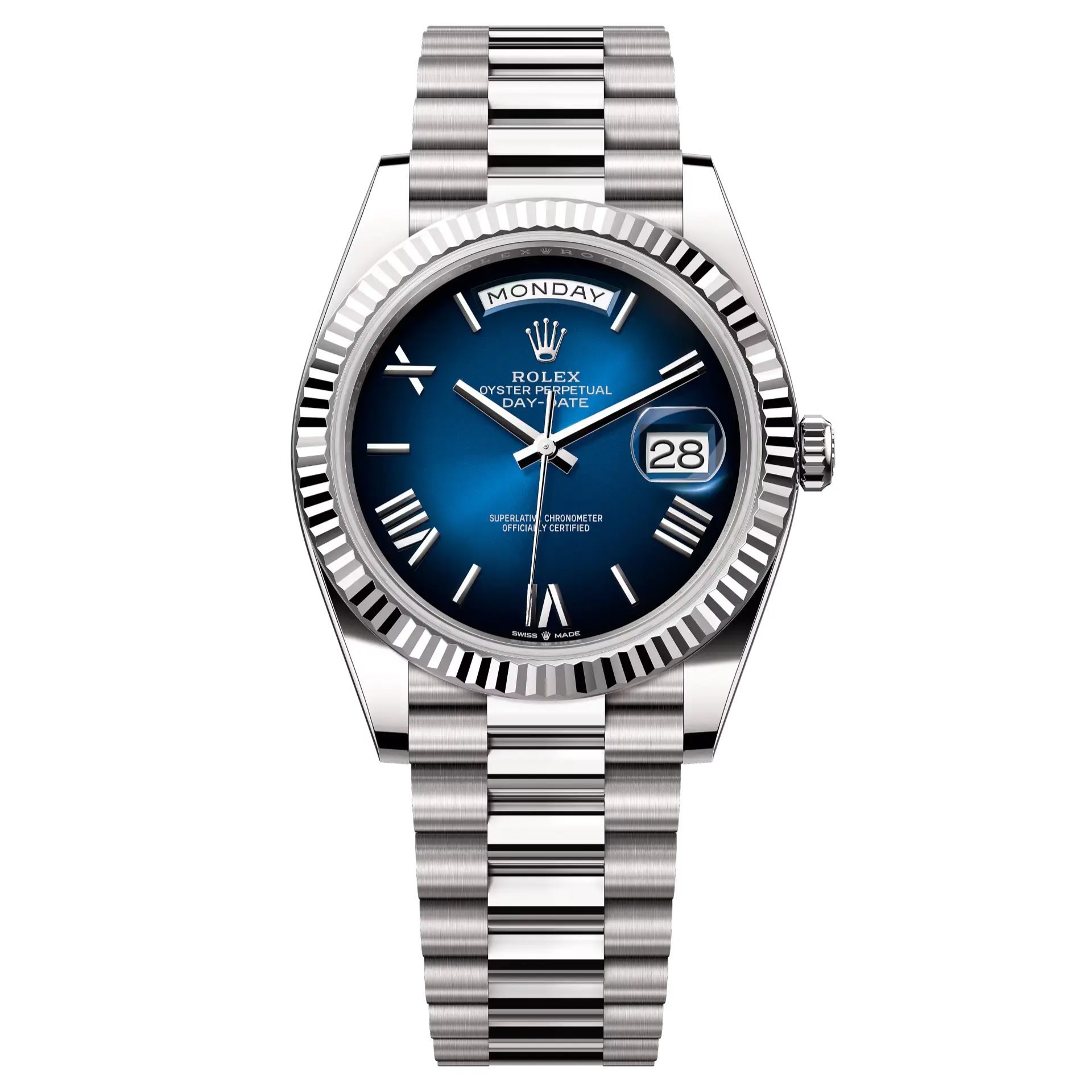 Day-Date 40 in 18 ct white gold with a blue ombré dial, fluted bezel and a President bracelet.