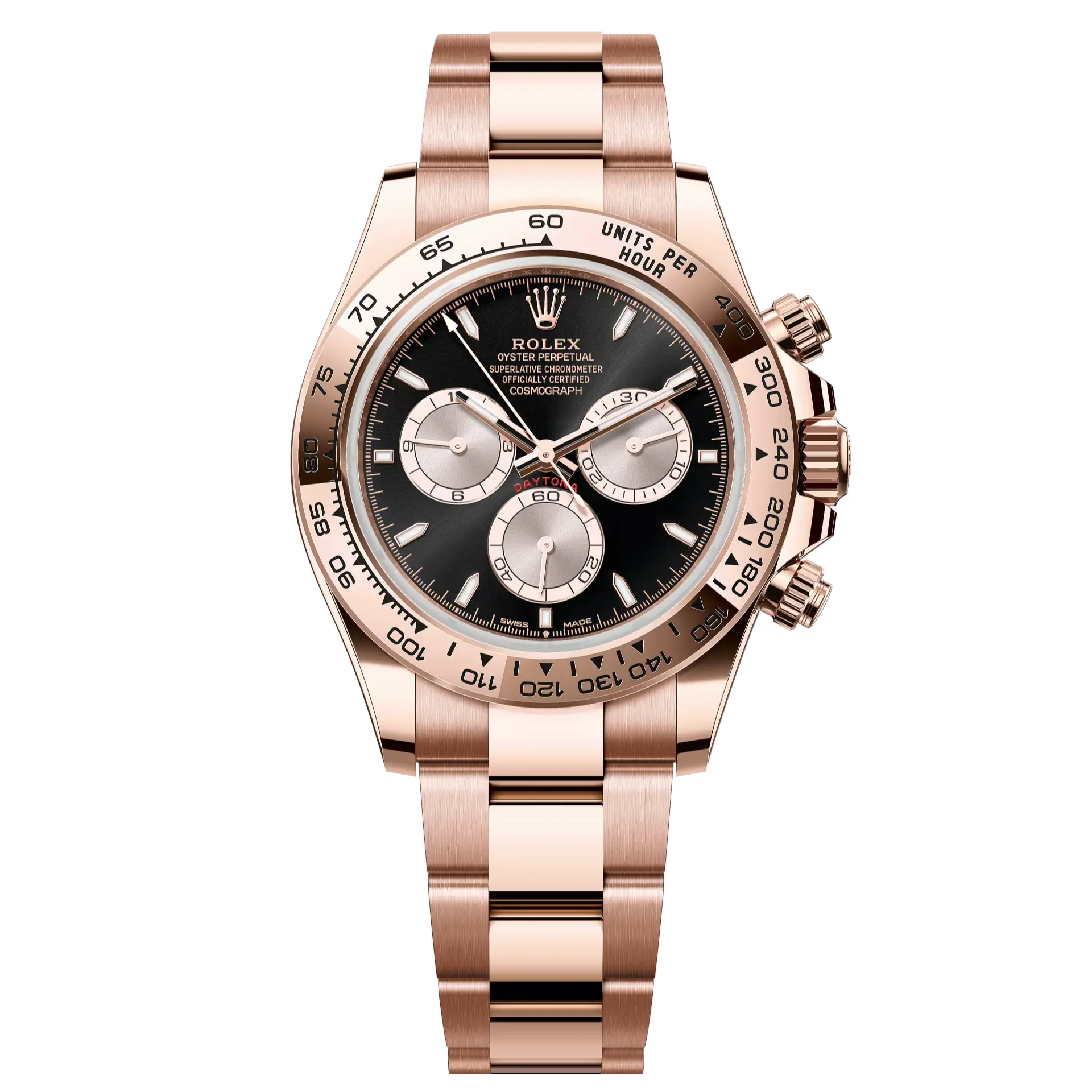 The Oyster Perpetual Cosmograph Daytona in 18 ct Everose gold combines refined elegance with professional chronograph performance. Its 40 mm Oyster case, crafted from solid Everose gold, exudes warmth and resilience, embodying the Daytona’s legacy of precision and style.