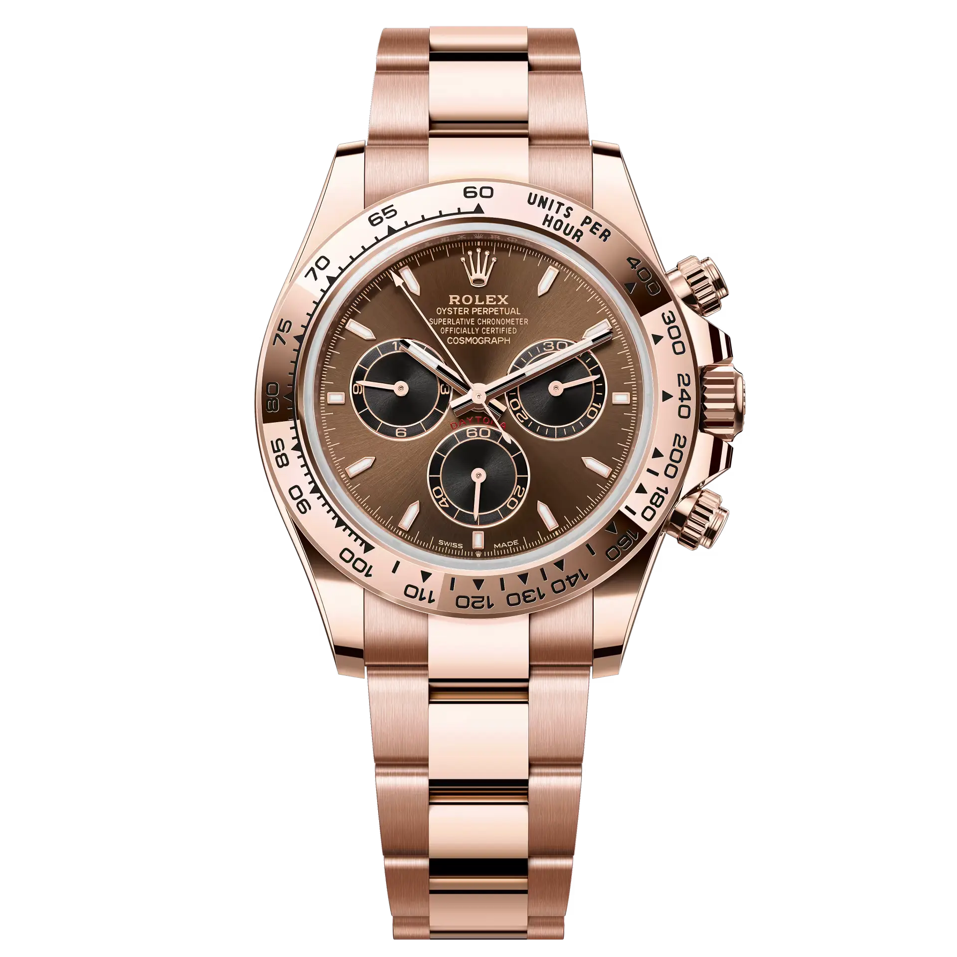 The Oyster Perpetual Cosmograph Daytona in 18 ct Everose gold combines elegance with high-performance chronograph functionality. Its 40 mm Oyster case, crafted from solid Everose gold, exudes warmth, durability, and the unmistakable prestige of this iconic timepiece.