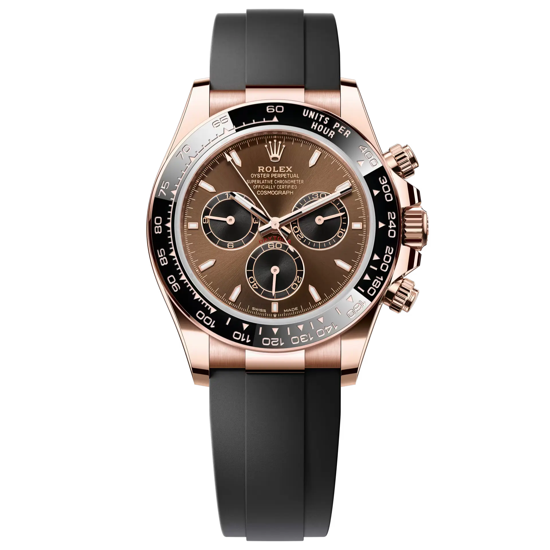Cosmograph Daytona in 18 ct Everose gold, with a chocolate and black dial and an Oysterflex bracelet, features a black Cerachrom bezel with tachymetric scale.