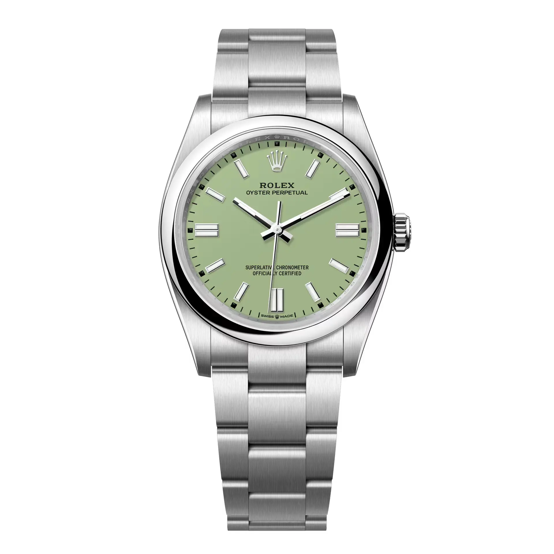 The Oyster Perpetual 36 with a pistachio dial and an Oyster bracelet.