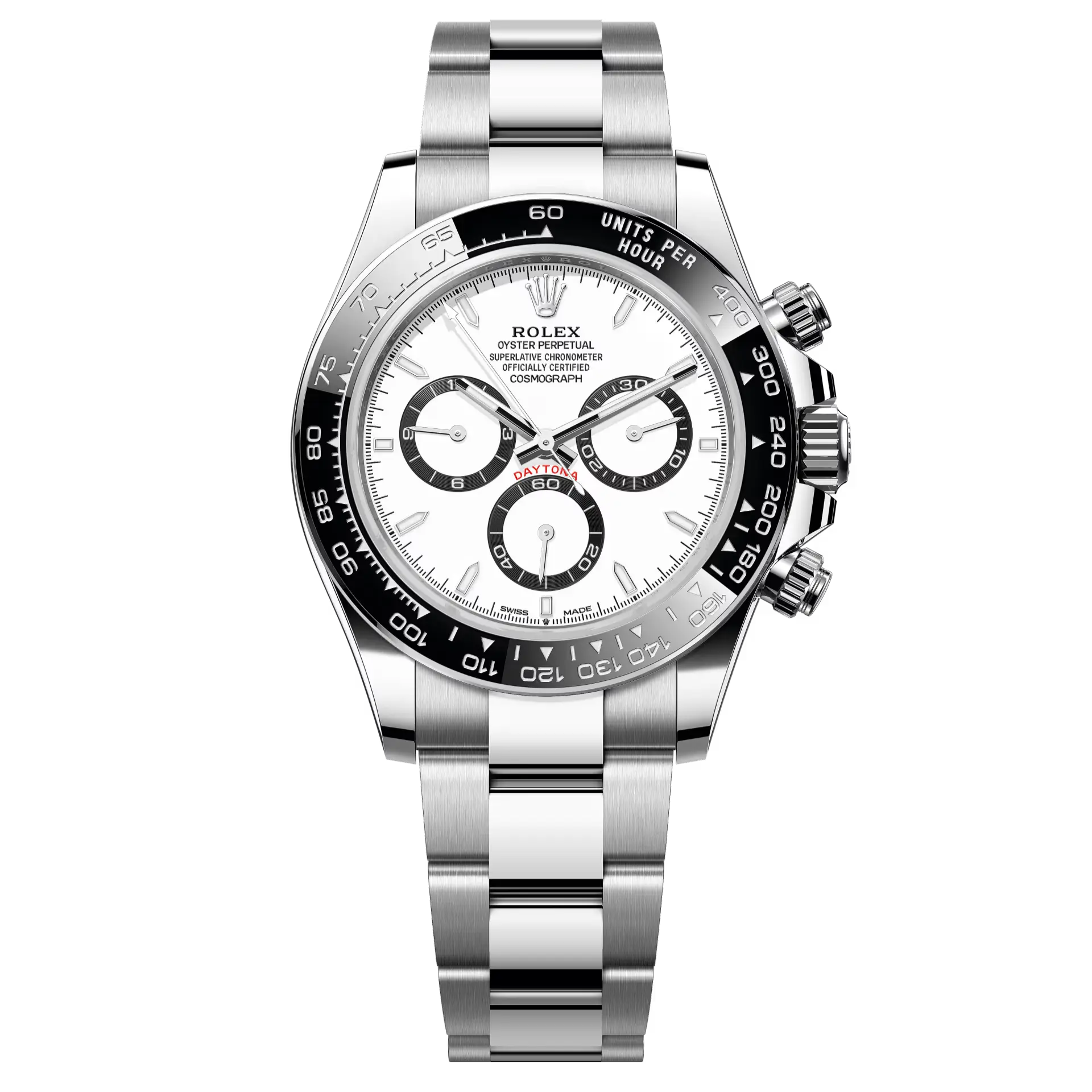 Water-resistant to 100 meters, the Daytona with white dial is a perfect blend of technical excellence, sporting spirit, and enduring elegance.